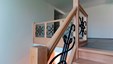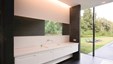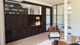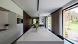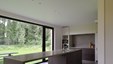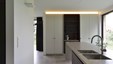 Het landelijke karakter van deze woning wordt geaccentueerd door de kamerhoge raampartijen, waarbij de uitgestrekte tuin vrijwel letterlijk een verlengstuk wordt van keuken en leefruimte. Nochtans werd voor het interieur resoluut gekozen voor een eigentijdse aanpak waar strakke lijnen en functionaliteit tastbaar worden door een knap staaltje vakmanschap. De kasten in donkere eik contrasteren perfect met de witgelakte MDF en composietsteen van de keuken. De statige middenblok in de hal omvat naast de vestiairekast nog het gastentoilet, en sluit anderzijds naadloos aan op de livingkasten en de eiken trap. De hoge detailleringsgraad is een streling voor het oog, iets wat de bouwheer ten zeerste kon waarderen. Ontwerp : MVH architectuur Realisatie totaalproject : Jos Heylen Fotografie : Claude Smekens